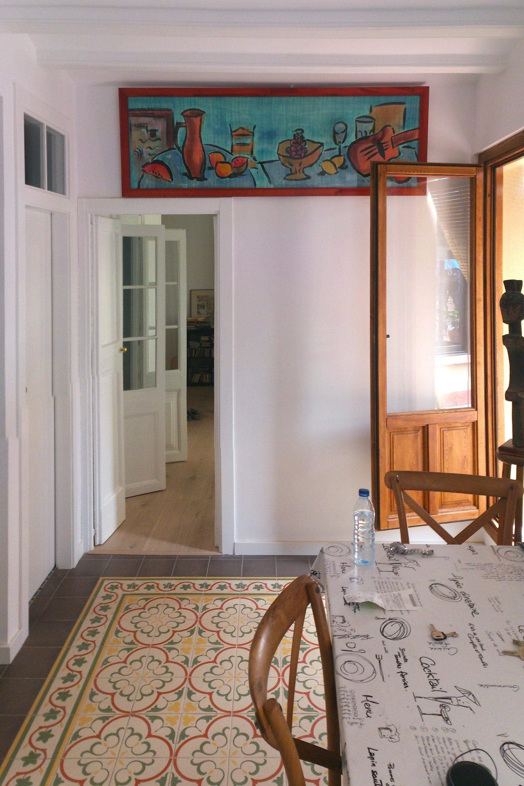 La reforma de esta vivienda en Barcelona se centró en la recuperación de su esencia clásica y su funcionalidad moderna. Se conservó la estructura tradicional del forjado, dejando a la vista las vigas de madera pintadas de blanco, un rasgo característico que aporta altura y luminosidad a los espacios. La distribución mantiene la compartimentación tradicional de las estancias, pero se flexibiliza mediante puertas amplias y el uso estratégico de elementos divisorios, como estanterías. Los materiales protagonistas son los suelos hidráulicos originales o recuperados que delimitan zonas clave (cocina, pasillos), combinados con parqué de madera clara en las estancias principales. Esta fusión de materiales y el respeto por los acabados históricos garantizan un ambiente de gran carácter, luminoso y adaptado a las necesidades de la vida contemporánea.