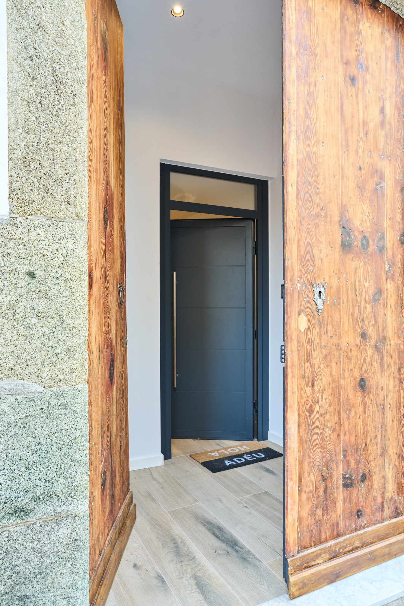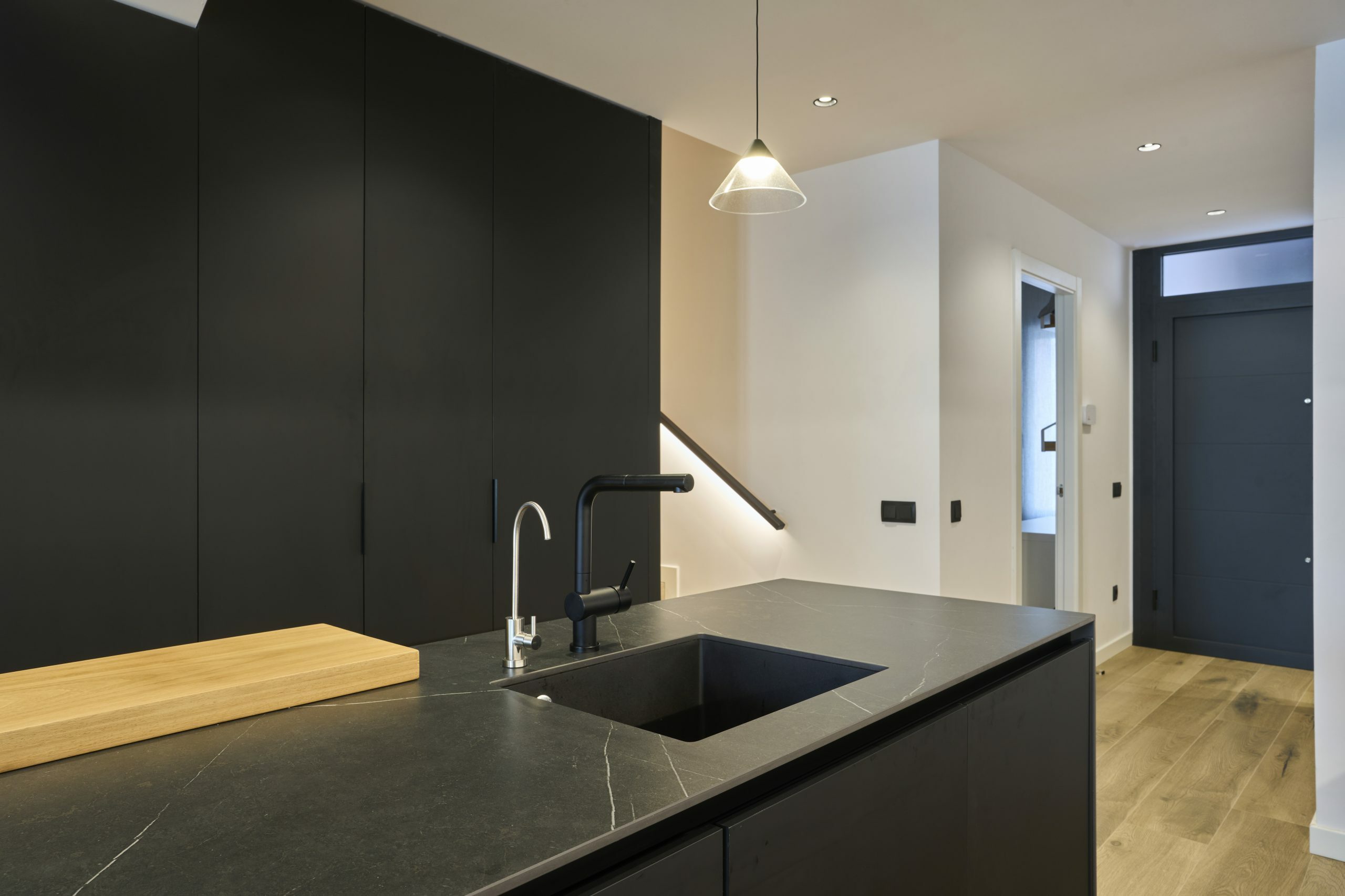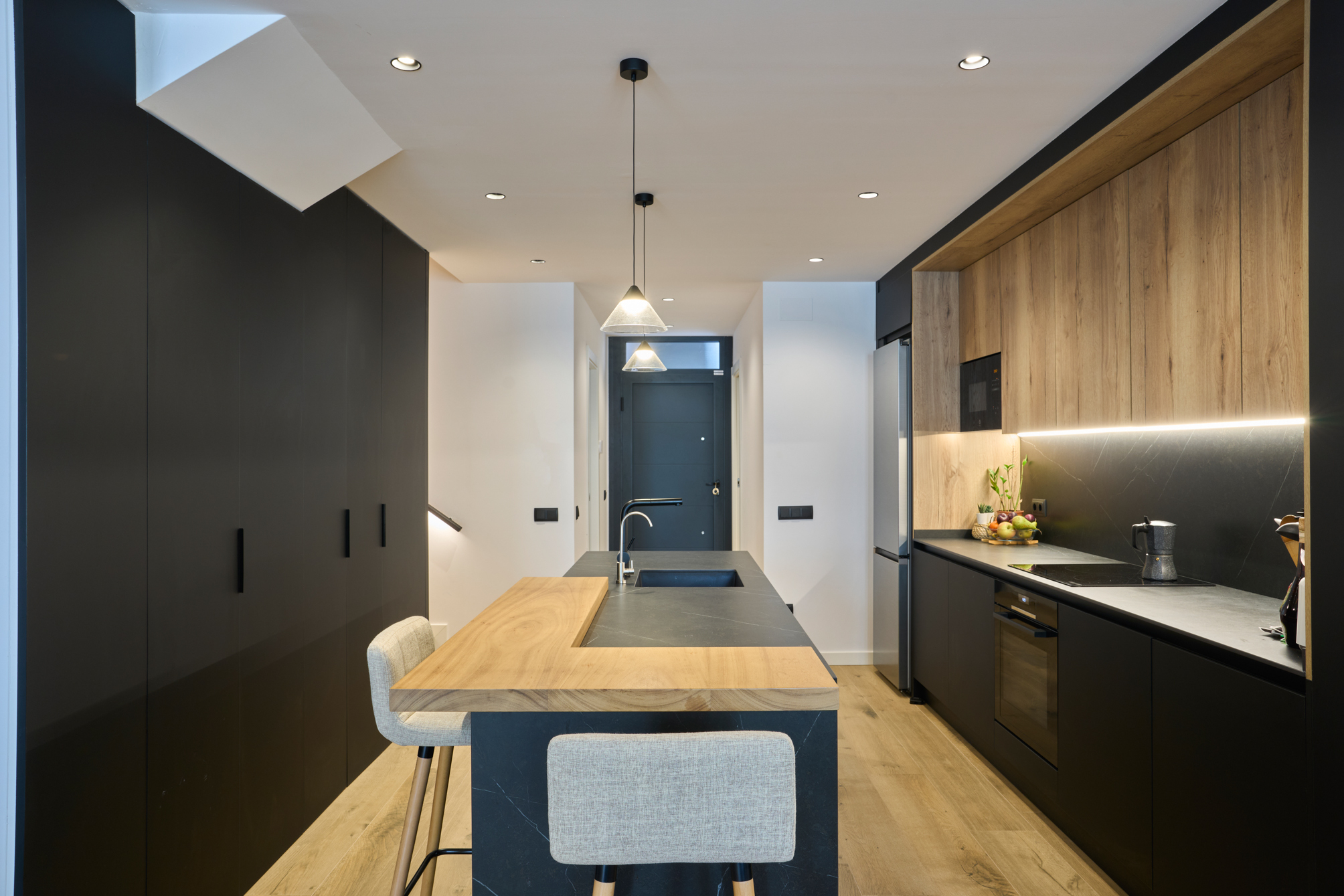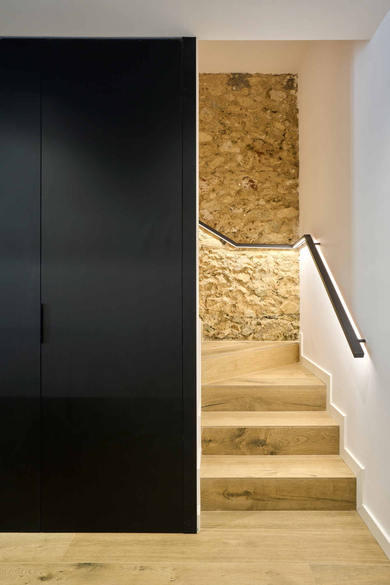 La vivienda recupera los muros de piedra originales, contrastando su textura rústica con la modernidad de la intervención. El diseño se enfoca en una distribución fluida que maximiza la luminosidad y la sensación de amplitud en los espacios. Los acabados se definen por un juego de contrastes: la madera clara en suelos y escaleras aporta calidez, mientras que el negro mate en carpintería y la cocina introduce sofisticación y líneas contemporáneas. Esta paleta de materiales y los acabados neutros buscan crear un ambiente que es, a la vez, funcional y con una fuerte personalidad, mezclando lo antiguo con lo actual.