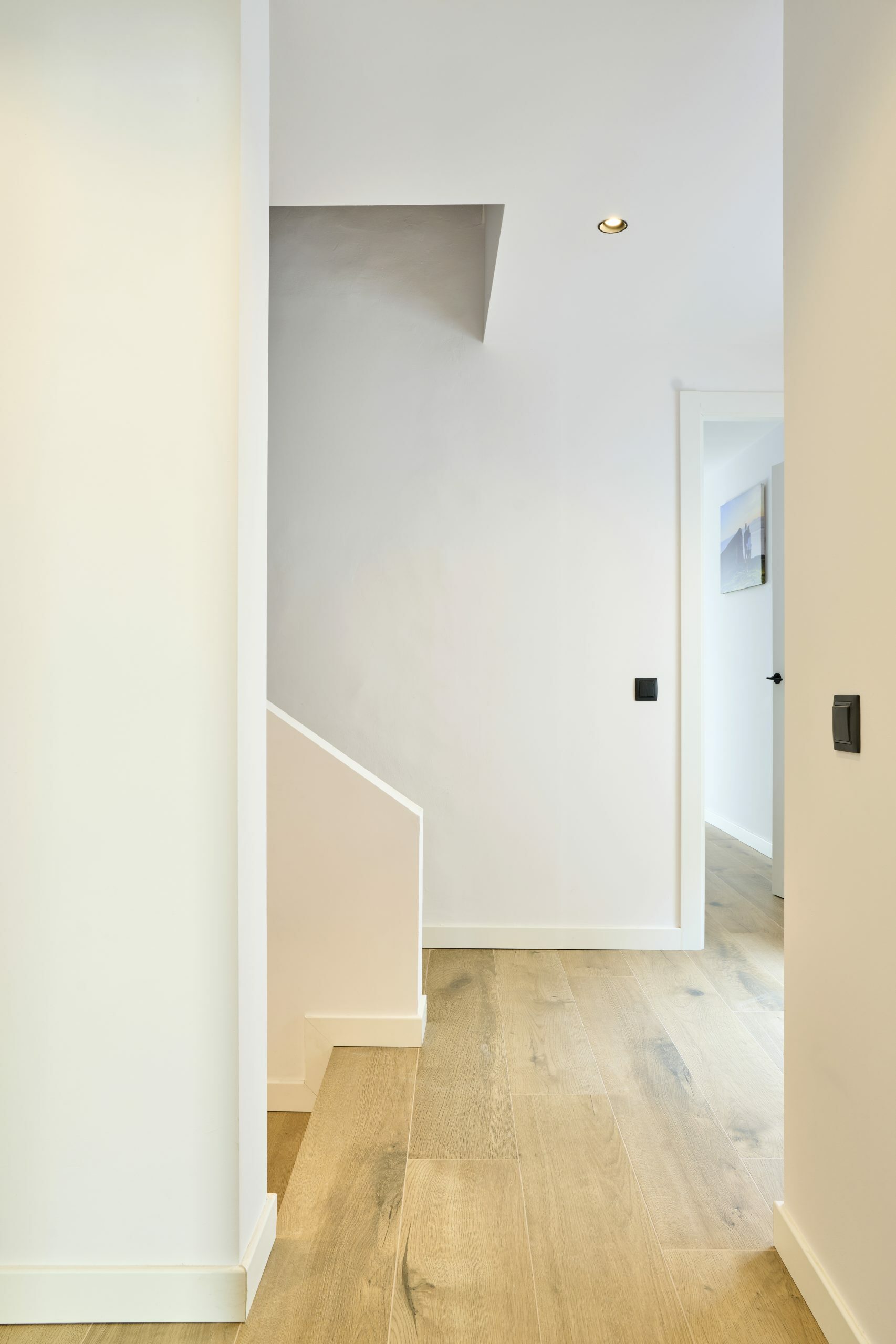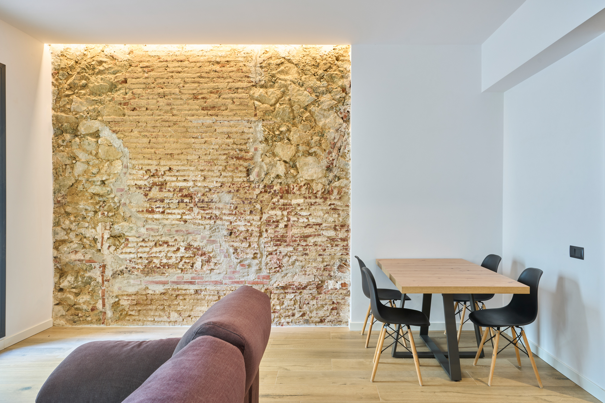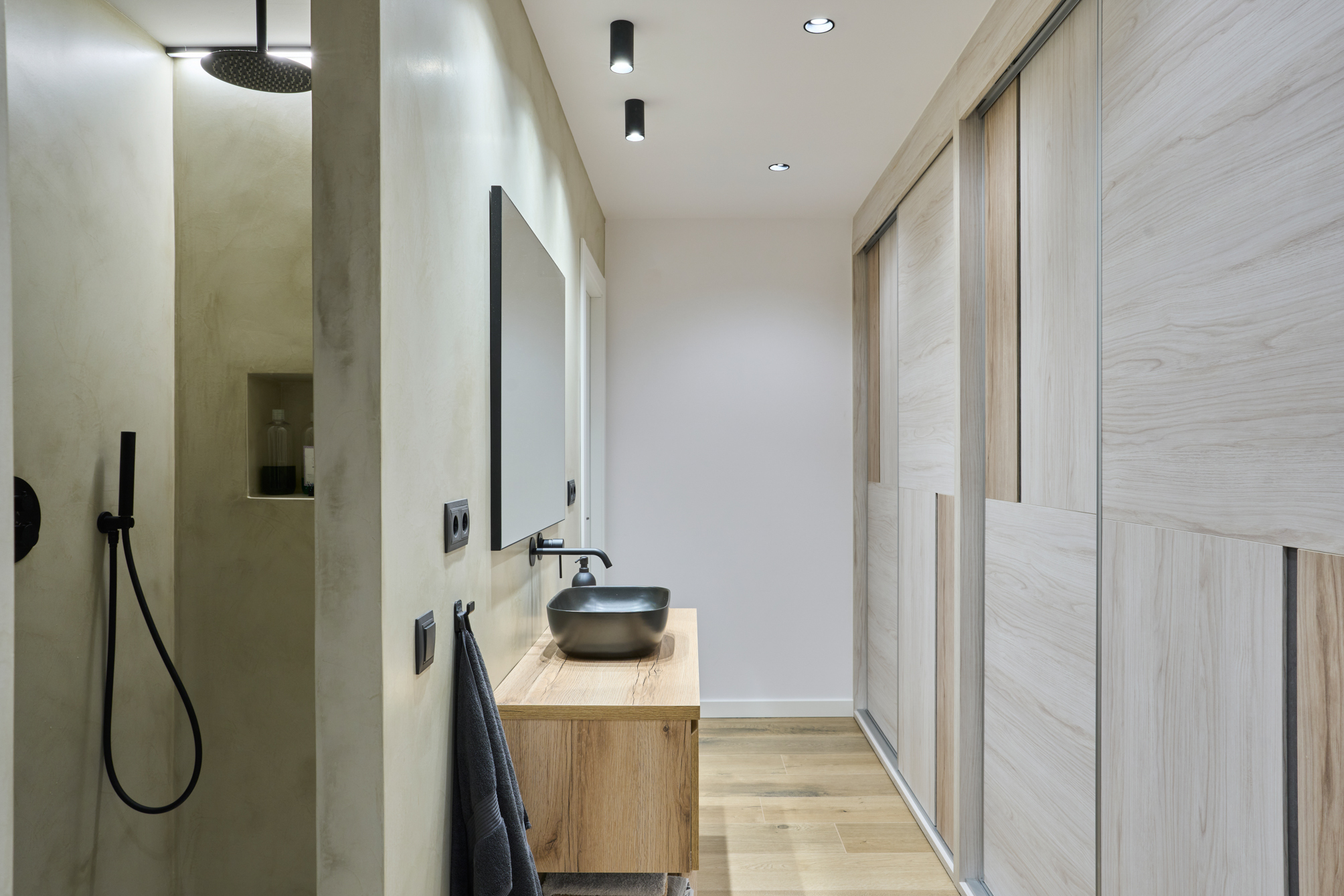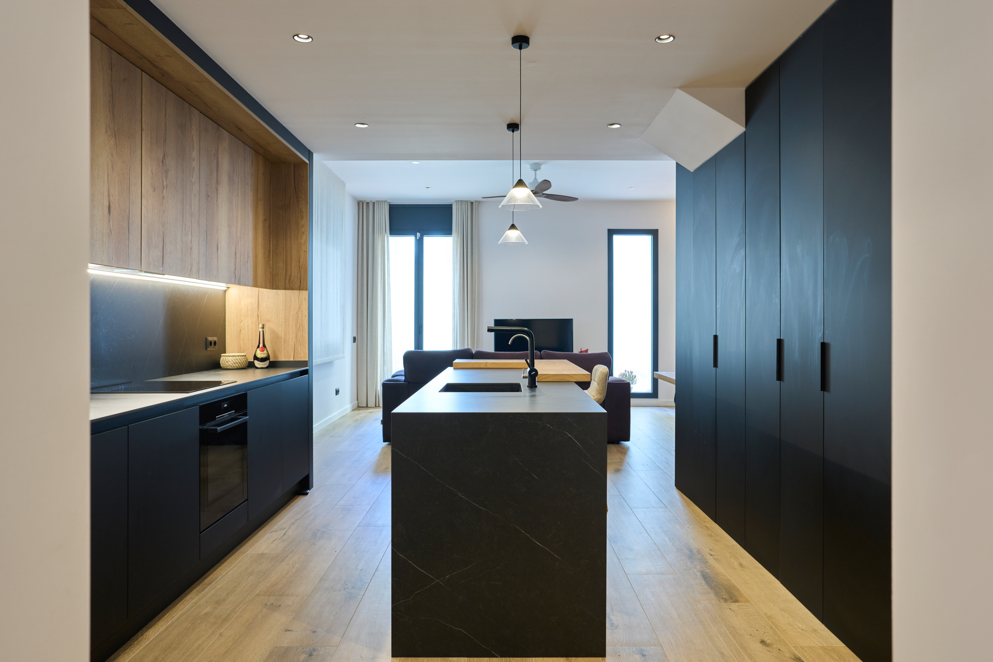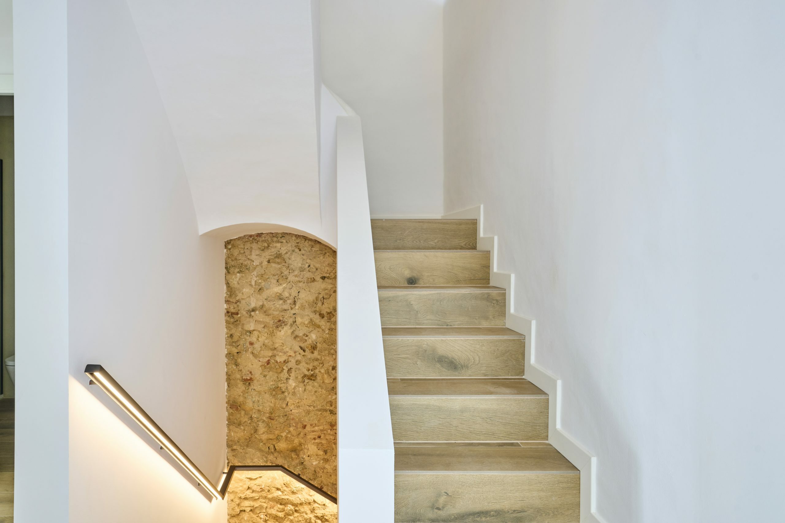 La vivienda recupera los muros de piedra originales, contrastando su textura rústica con la modernidad de la intervención. El diseño se enfoca en una distribución fluida que maximiza la luminosidad y la sensación de amplitud en los espacios. Los acabados se definen por un juego de contrastes: la madera clara en suelos y escaleras aporta calidez, mientras que el negro mate en carpintería y la cocina introduce sofisticación y líneas contemporáneas. Esta paleta de materiales y los acabados neutros buscan crear un ambiente que es, a la vez, funcional y con una fuerte personalidad, mezclando lo antiguo con lo actual.