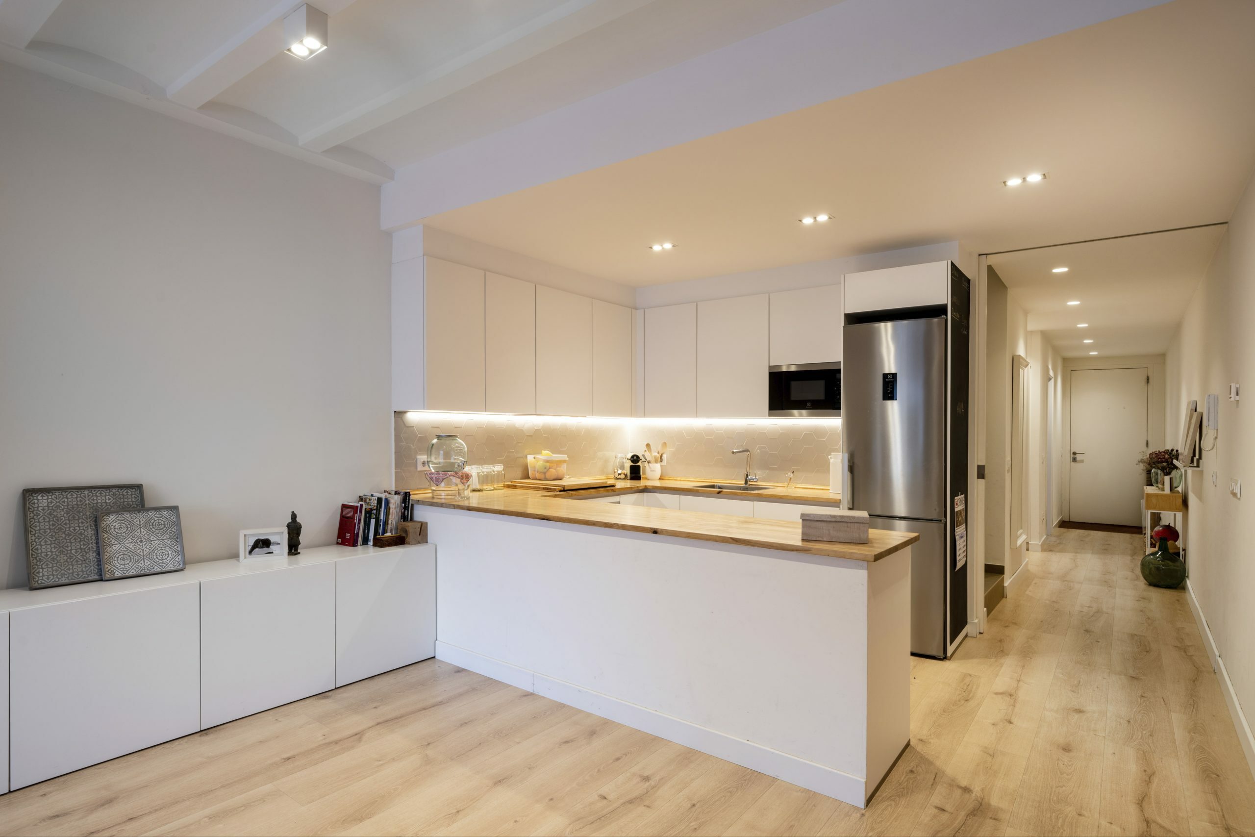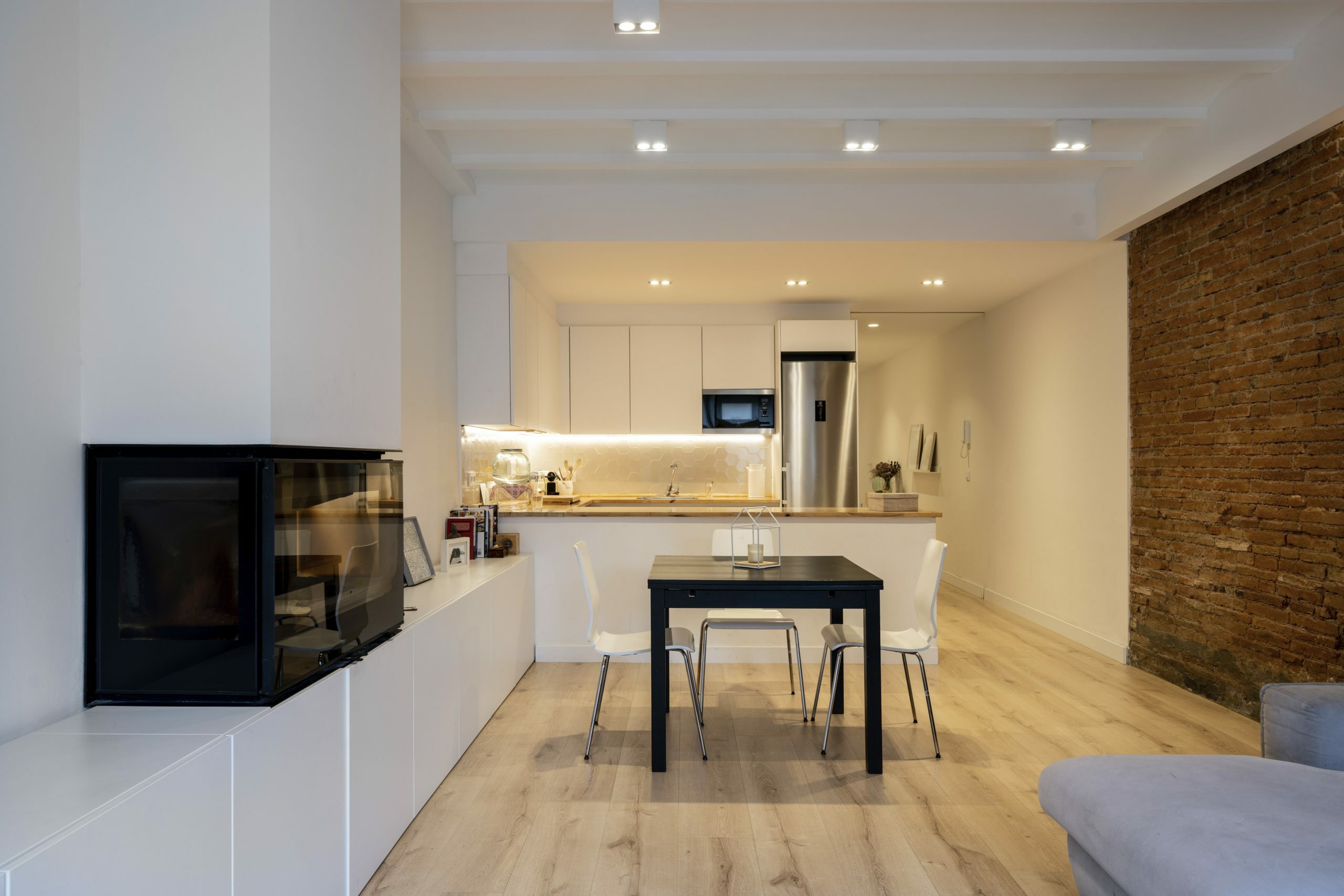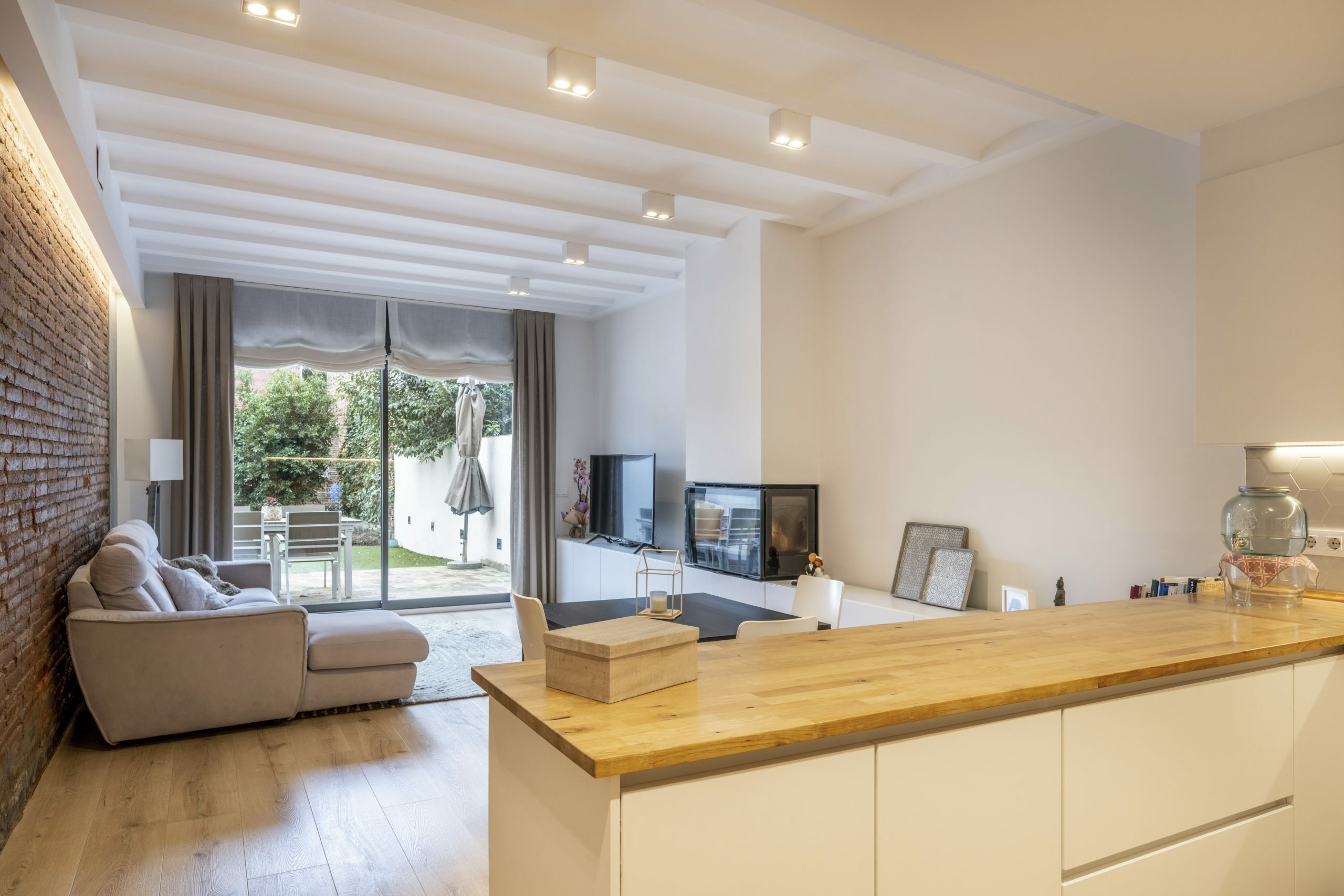 El proyecto plantea un espacio continuo donde la cocina, el comedor y la zona de estar se relacionan sin barreras. La cocina en línea destaca por su diseño limpio y funcional, con mobiliario blanco que amplifica la luz. La encimera de madera introduce un contraste cálido, integrando el área de trabajo con el comedor. La chimenea, encastrada en un mueble a medida, funciona como un elemento organizador que aporta carácter y refuerza la fluidez espacial. La integración con el exterior se resuelve mediante grandes aperturas que potencian la conexión visual y la iluminación natural.