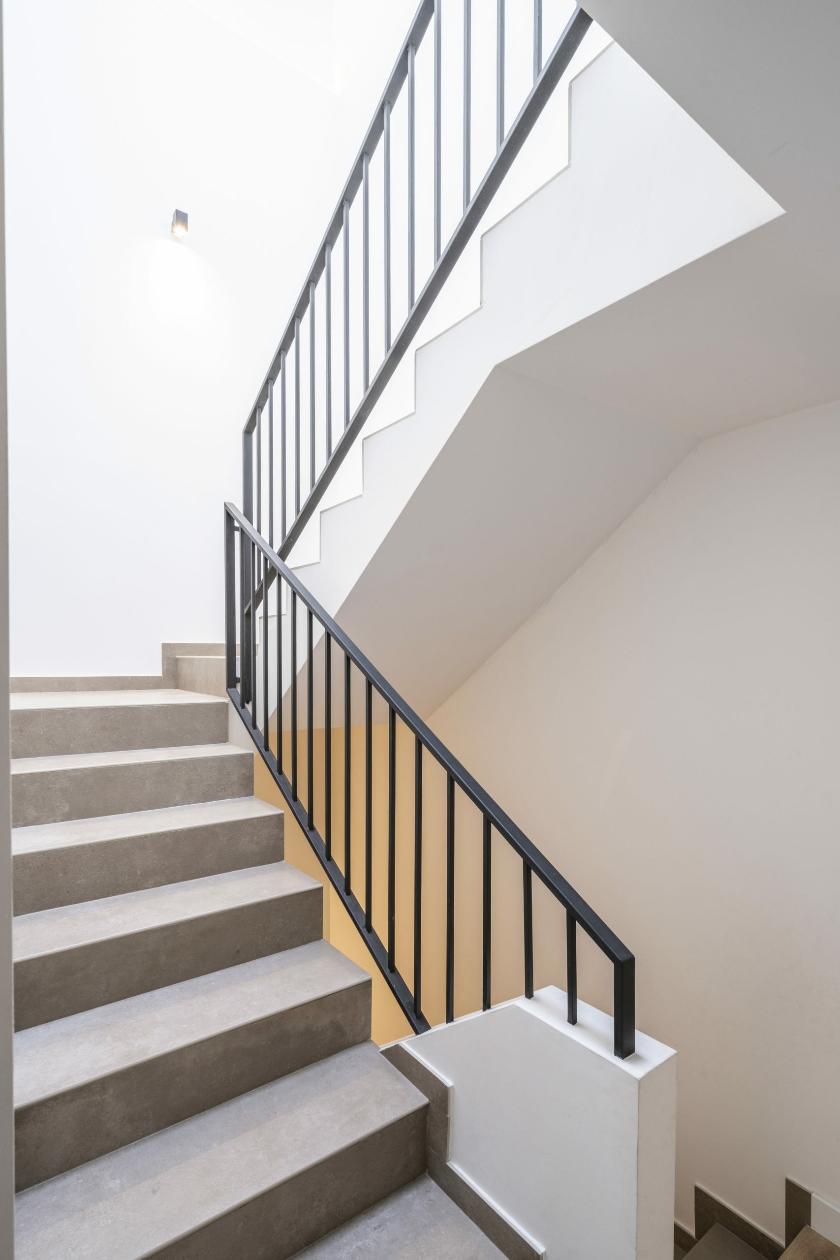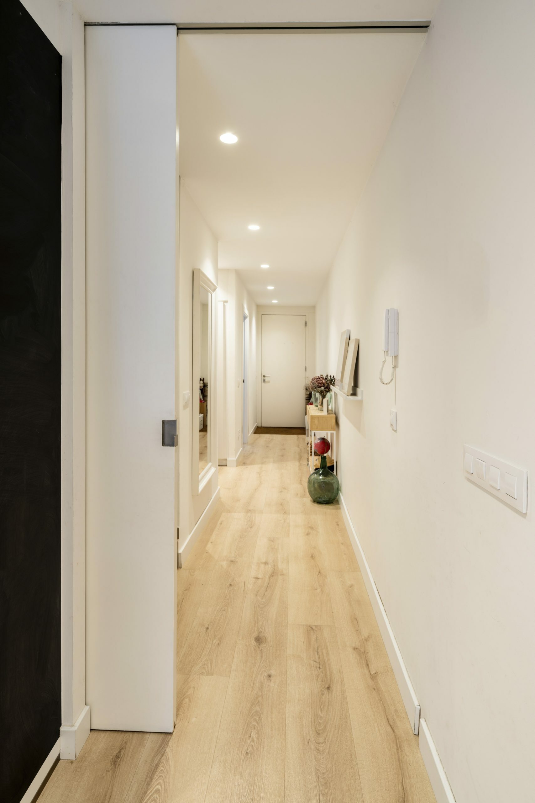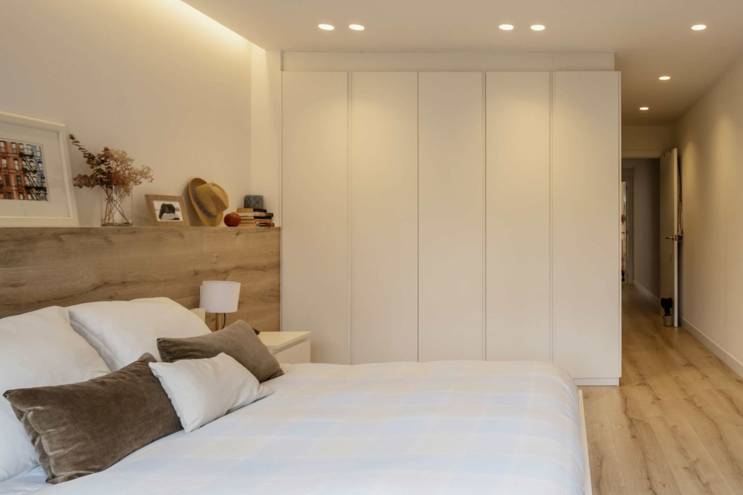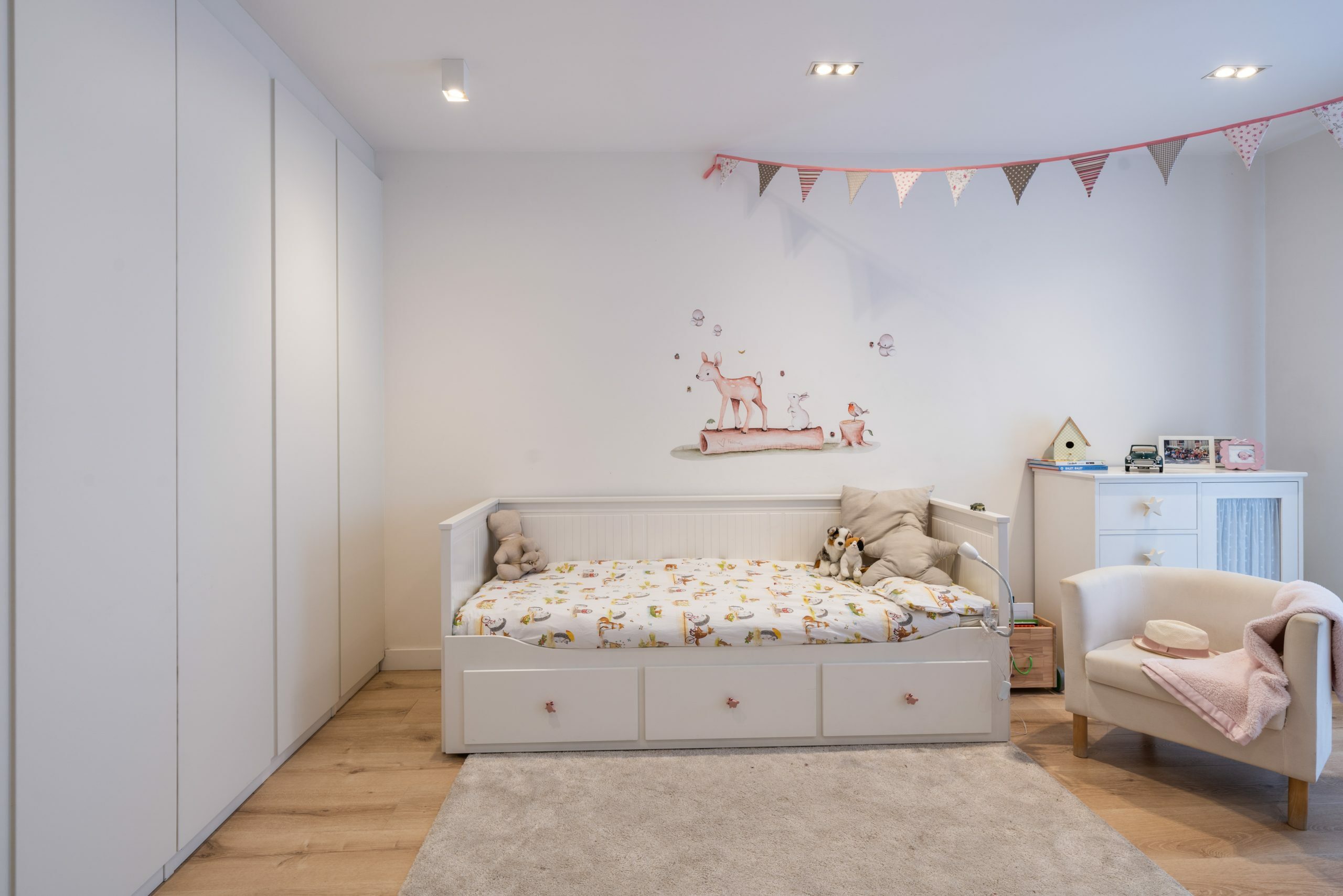 El proyecto plantea un espacio continuo donde la cocina, el comedor y la zona de estar se relacionan sin barreras. La cocina en línea destaca por su diseño limpio y funcional, con mobiliario blanco que amplifica la luz. La encimera de madera introduce un contraste cálido, integrando el área de trabajo con el comedor. La chimenea, encastrada en un mueble a medida, funciona como un elemento organizador que aporta carácter y refuerza la fluidez espacial. La integración con el exterior se resuelve mediante grandes aperturas que potencian la conexión visual y la iluminación natural.