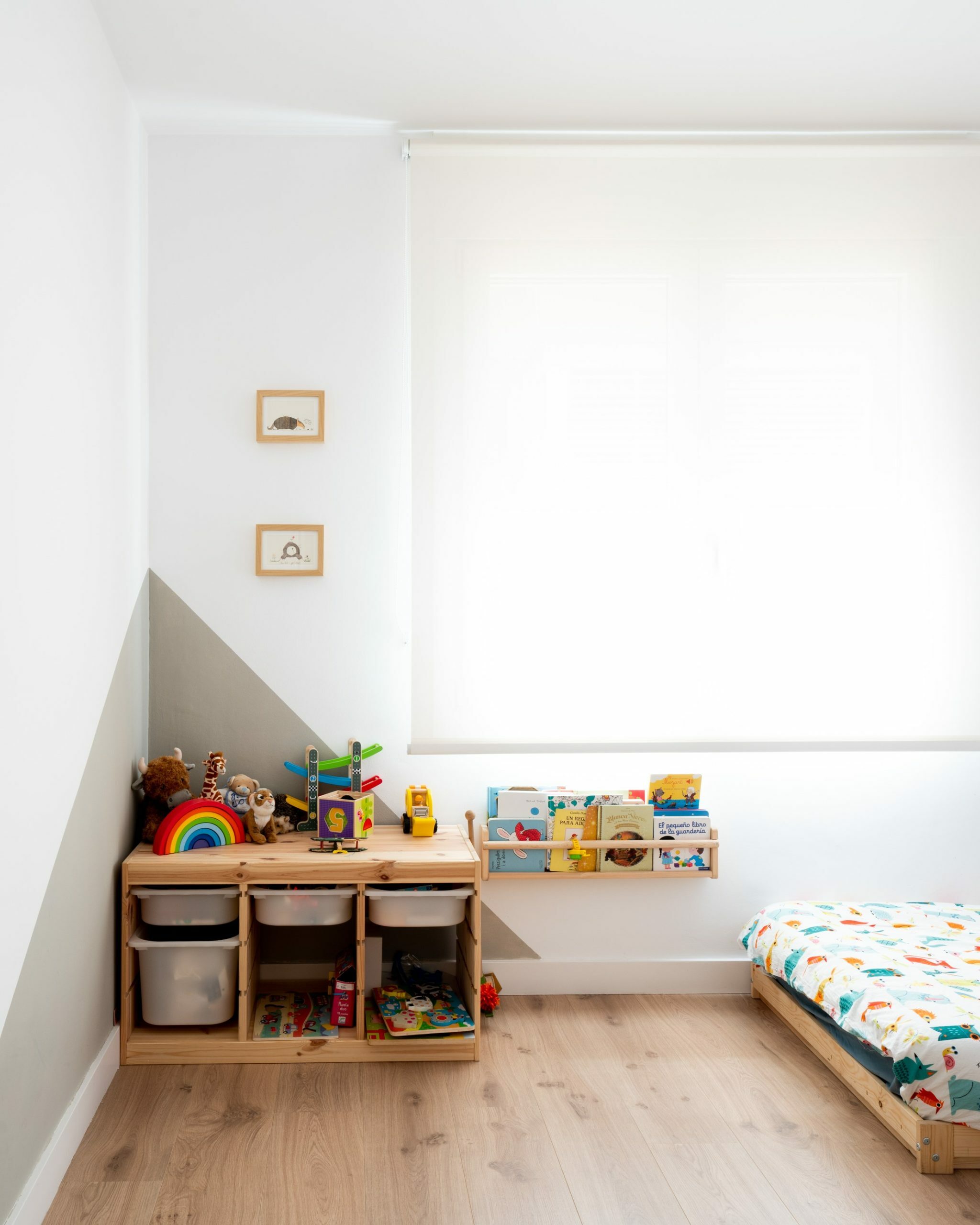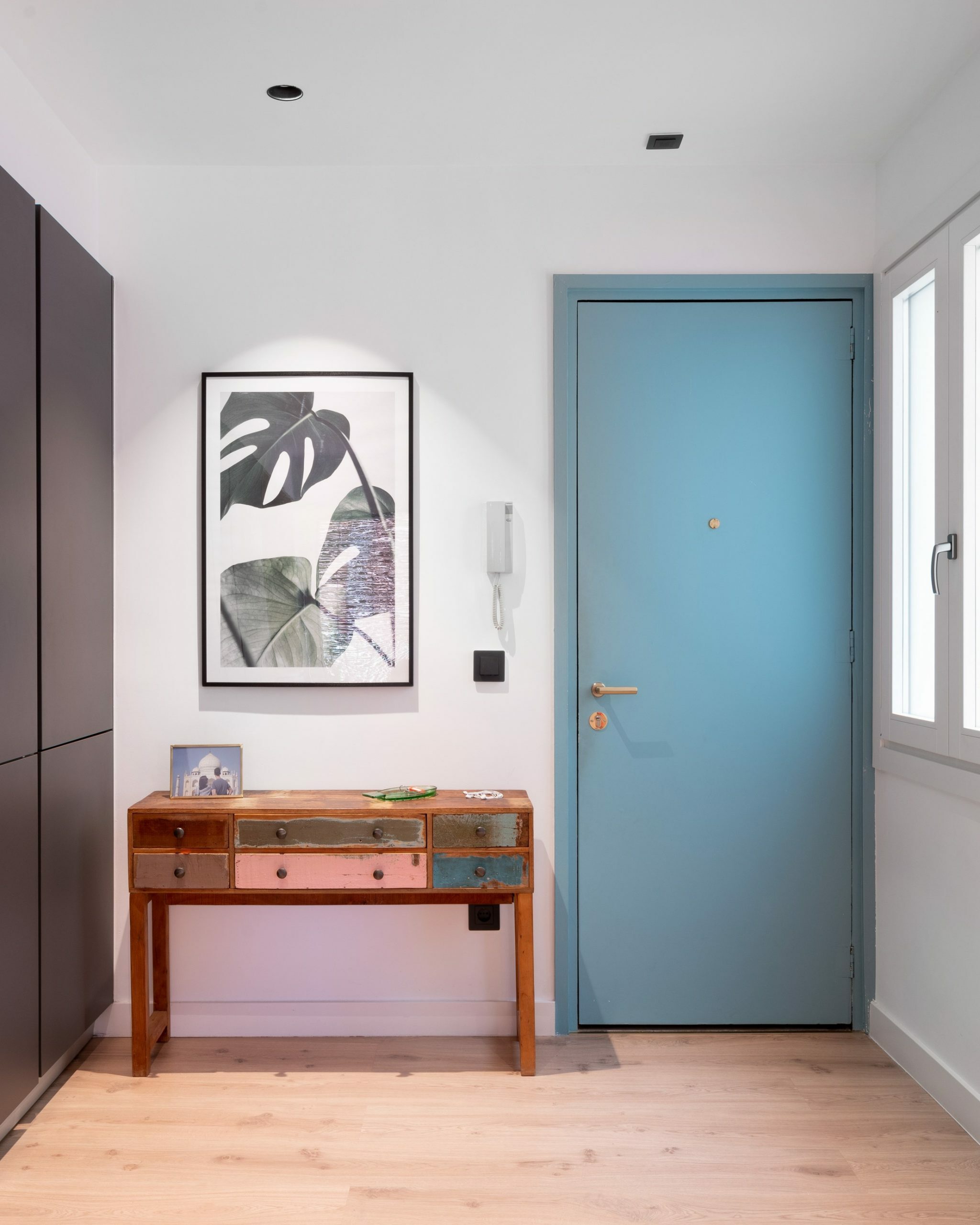 Esta vivienda se organiza en torno a una planta diáfana que conecta cocina, comedor y salón, favoreciendo la amplitud visual y la entrada de luz natural desde las grandes aperturas a fachada. La estructura existente se adapta a una distribución funcional que distingue con claridad las zonas de día y de noche, garantizando un uso cómodo y eficiente del espacio. Los materiales se basan en una combinación de madera natural en suelos, carpinterías en tonos oscuros y paramentos blancos, generando un contraste equilibrado y luminoso. En los baños, la mezcla de cerámica y acabados de madera aporta continuidad y coherencia material. La incorporación de una terraza protegida con lamas de madera añade un espacio intermedio que enriquece la relación entre interior y exterior. En conjunto, el proyecto busca una solución práctica y clara, respetando la estructura y potenciando la funcionalidad de cada estancia.