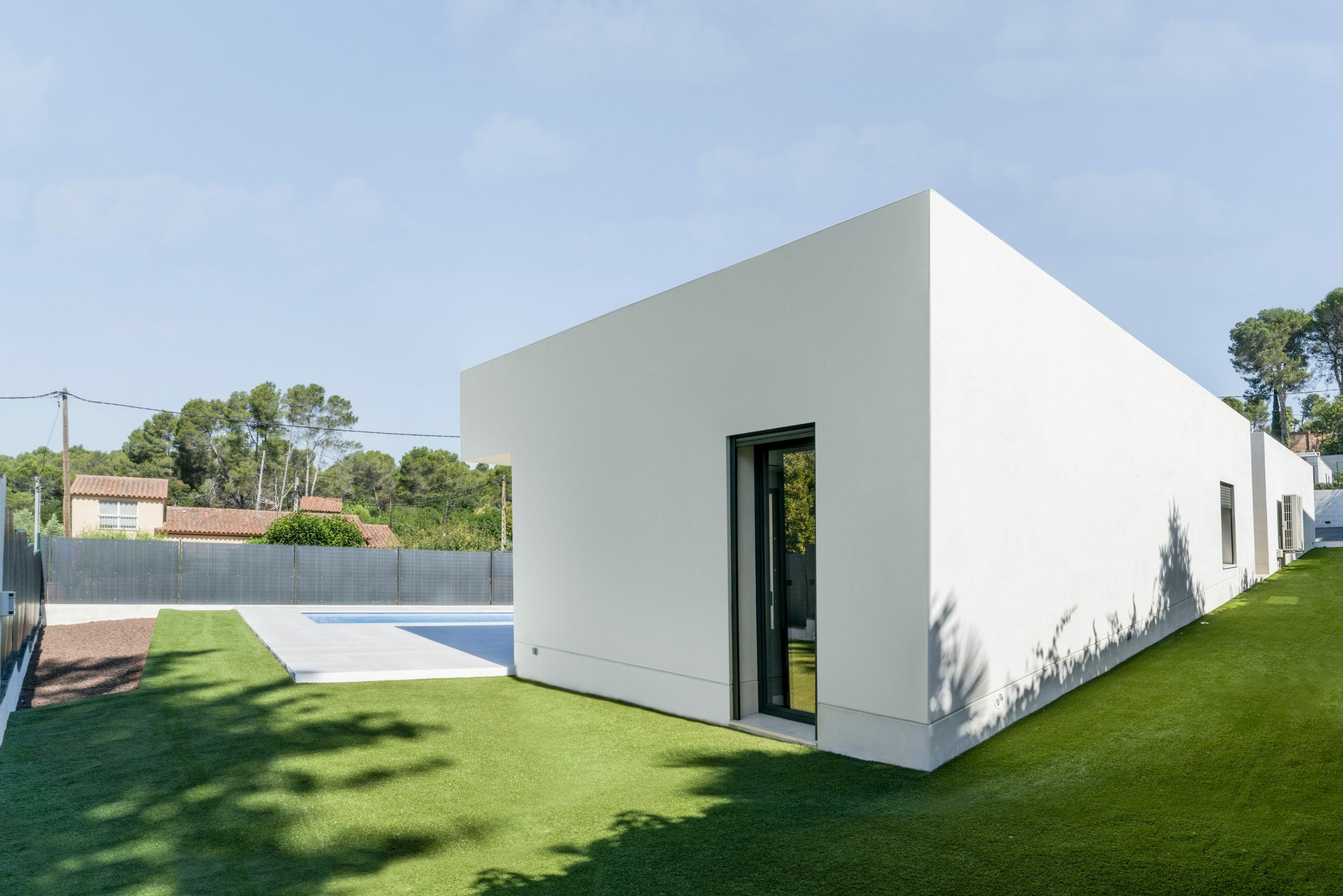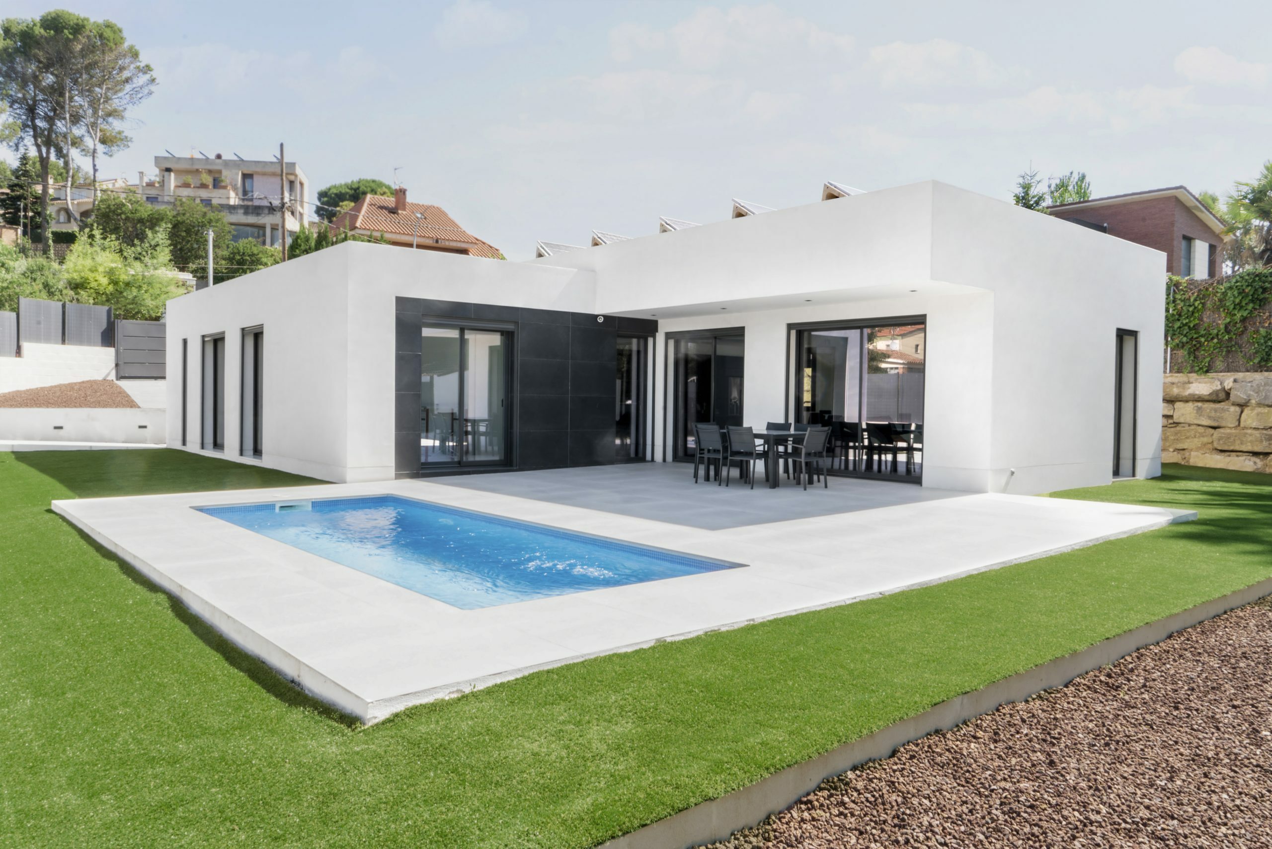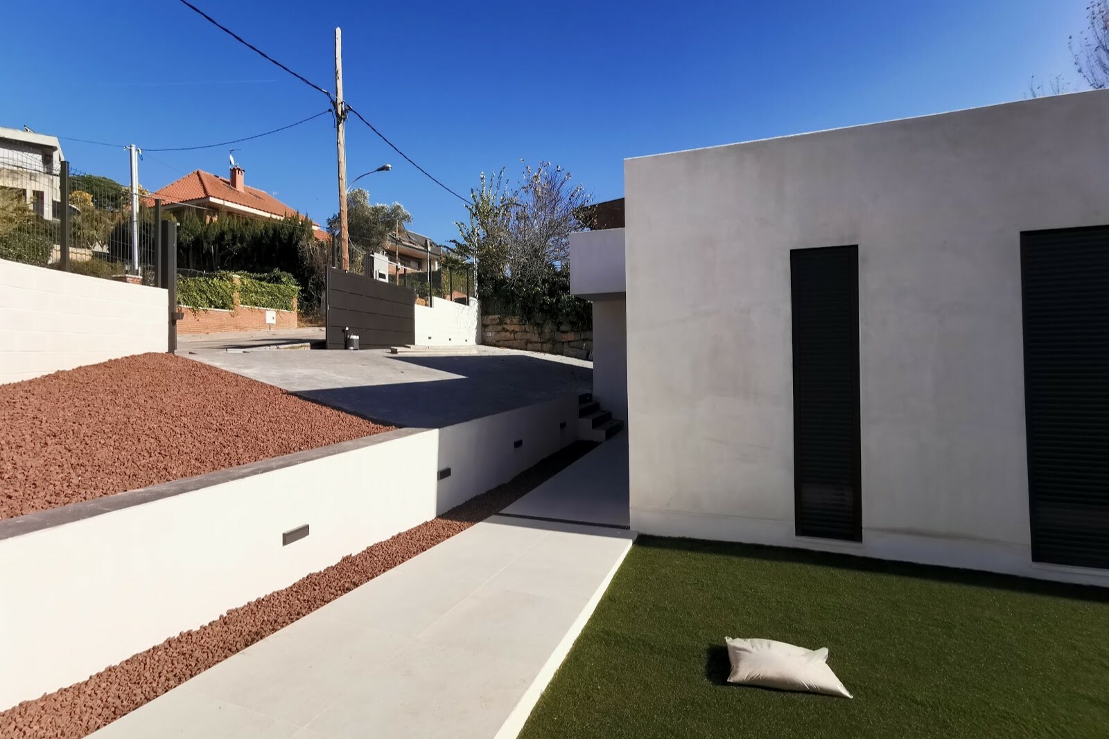 Esta vivienda unifamiliar destaca por su arquitectura contemporánea de líneas rectas y volúmenes bien definidos. El juego de volúmenes y los contrastes entre materiales hacen que esta vivienda tenga una estética equilibrada y moderna. La combinación de tonos blancos con detalles en negro aporta un carácter elegante y atemporal. El diseño de la piscina y su integración con el pavimento refuerzan el concepto de continuidad visual entre los espacios. Cada elemento ha sido pensado para aportar funcionalidad y diseño, sin perder la armonía con el paisaje. Un diseño pensado para adaptarse al entorno y maximizar la luz natural.