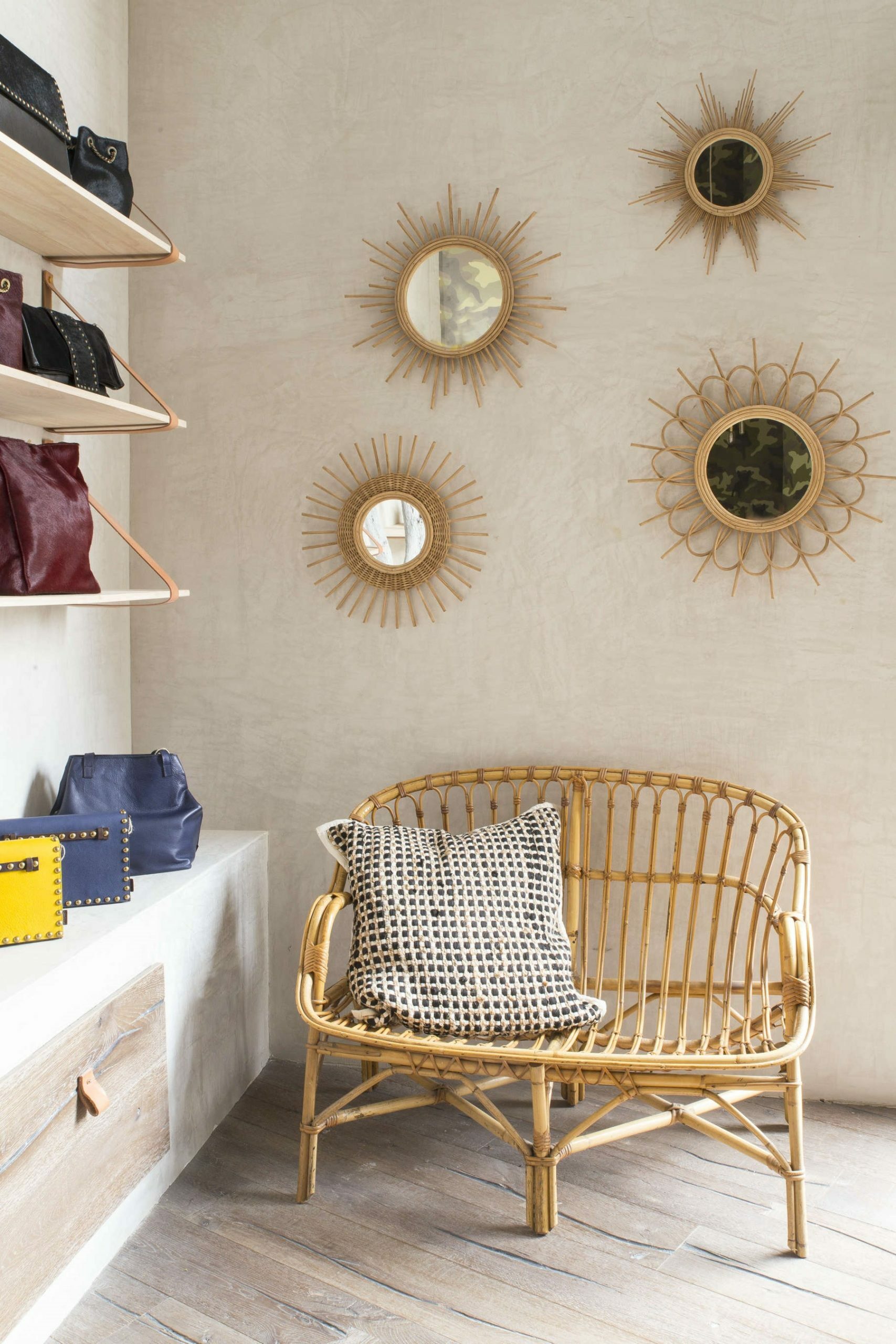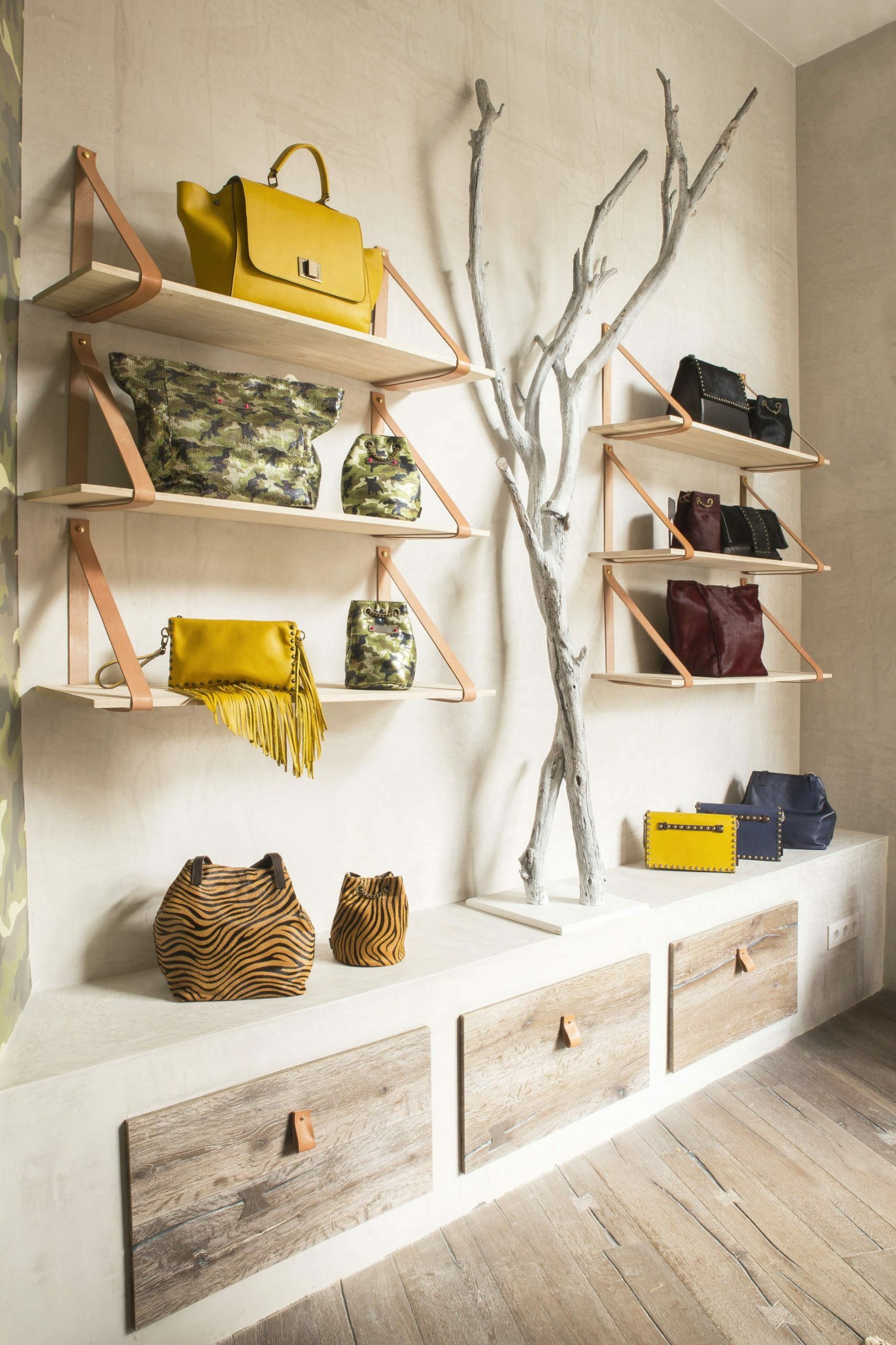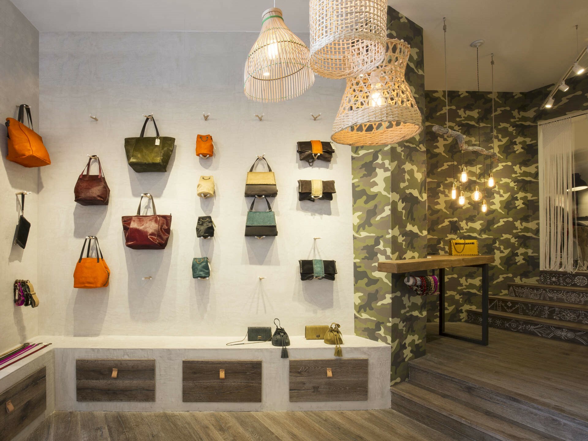 La reforma de esta tienda en Barcelona se concibió para crear un ambiente que refuerce la identidad de la marca. La distribución está optimizada para la exposición, usando las paredes como principal soporte visual. Un rasgo característico es el sistema de estanterías ligero, fijado con tiras de cuero, que permite flexibilidad en la muestra del producto. Los materiales protagonistas son la madera clara en paneles y mobiliario, combinados con elementos orgánicos como ramas naturales y piezas de mimbre. Esta fusión de texturas y el uso de patrones gráficos garantizan una funcionalidad visual y un espacio de venta acogedor.