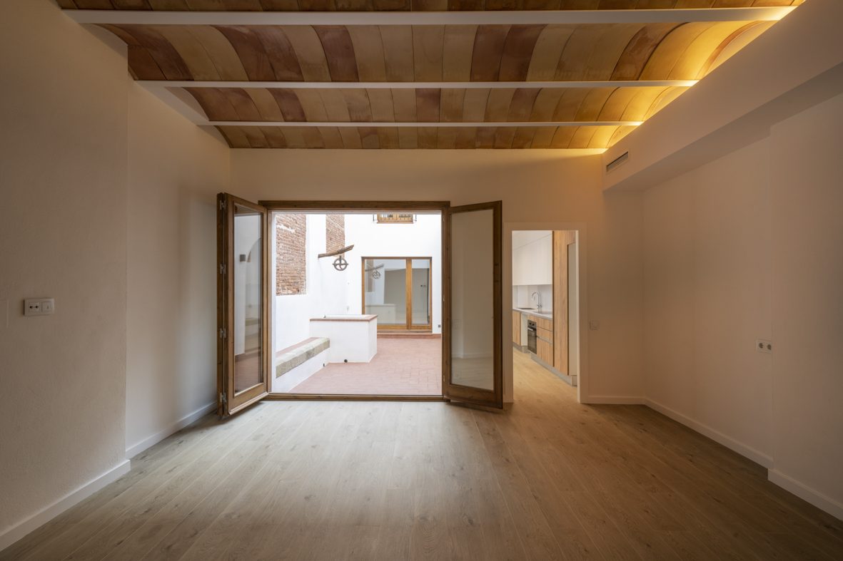 La reforma de esta vivienda en Arenys destaca por una distribución que se organiza alrededor de un patio central, maximizando la entrada de luz natural y la funcionalidad de las aperturas arqueadas. Hay una puesta en valor de la estructura original, la construcción tradicional y la interacción con los espacios exteriores. Se han recuperado las voltas catalanas de ladrillo visto, un rasgo característico que aporta calidez y textura histórica a los interiores. En cuanto a los materiales, el diseño se basa en el contraste entre los tonos terrosos de la cerámica y la piedra recuperada y la paleta moderna del blanco en mobiliario de cocina y paredes. Los suelos de madera clara unifican las estancias, logrando un equilibrio entre el pasado rústico y una habitabilidad contemporánea. Se conserva la estética de las fachadas para que el edificio se integre correctamente en el núcleo del pueblo.